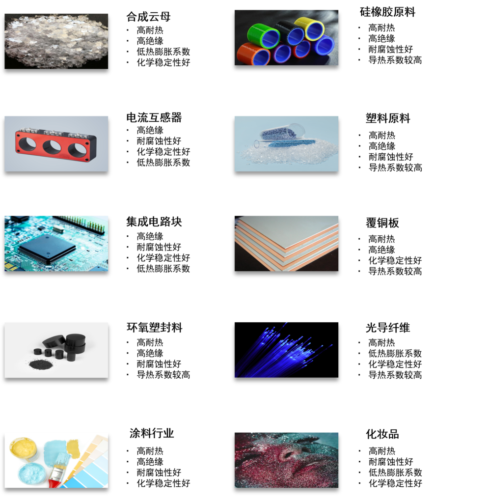 公司共研发生产了两大类7种产品,可广泛应用于环氧塑封料、履铜板、电子油墨、光导纤维、化妆品、陶瓷复合材料、涂料行业、电工行业等诸多领域。